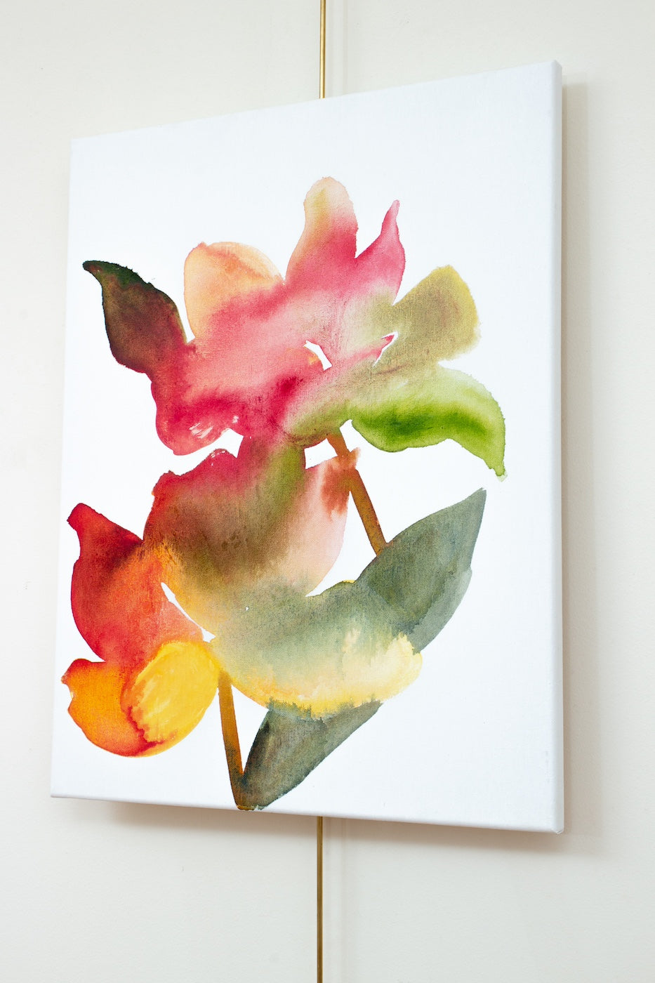 16" x 20" original acrylic or watercolor botanical abstract flower painting on canvas. Varnished and ready-to-hang. Expressive, loose, watery, minimalist, modern style by contemporary fine artist Elizabeth Becker. Prints available. Bright and colorful. Vibrant red, dark fuchsia pink and olive green colors.